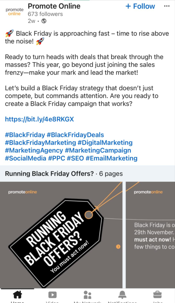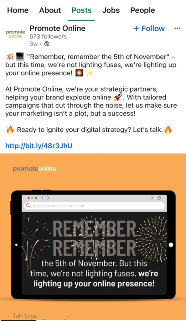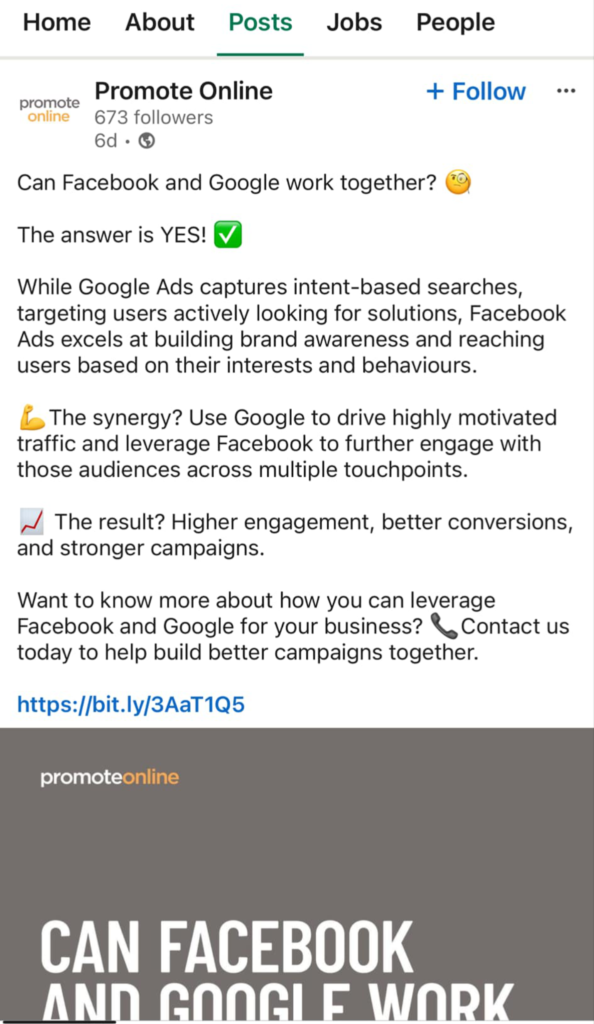 A sampling of social media copy and tracked internal links for the Promote Online agency internal social media channels. Below are examples from their LinkedIn.